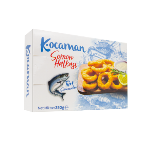 Türk Somonu Halkaları %70, Kaplama Malzemesi (Buğday unu, su, tuz, maya, zerdeçal, paprika ekstraktı ), Buğday nişastası, Bitkisel yağlar (Palm yağı ), Kabartıcılar (Difosfatlar, sodyum karbonatlar)